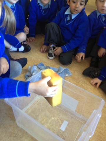 We learned that wool, tissue, sponge, towel, crepe paper all absorbed water. The only material that kept out the water was plastic.